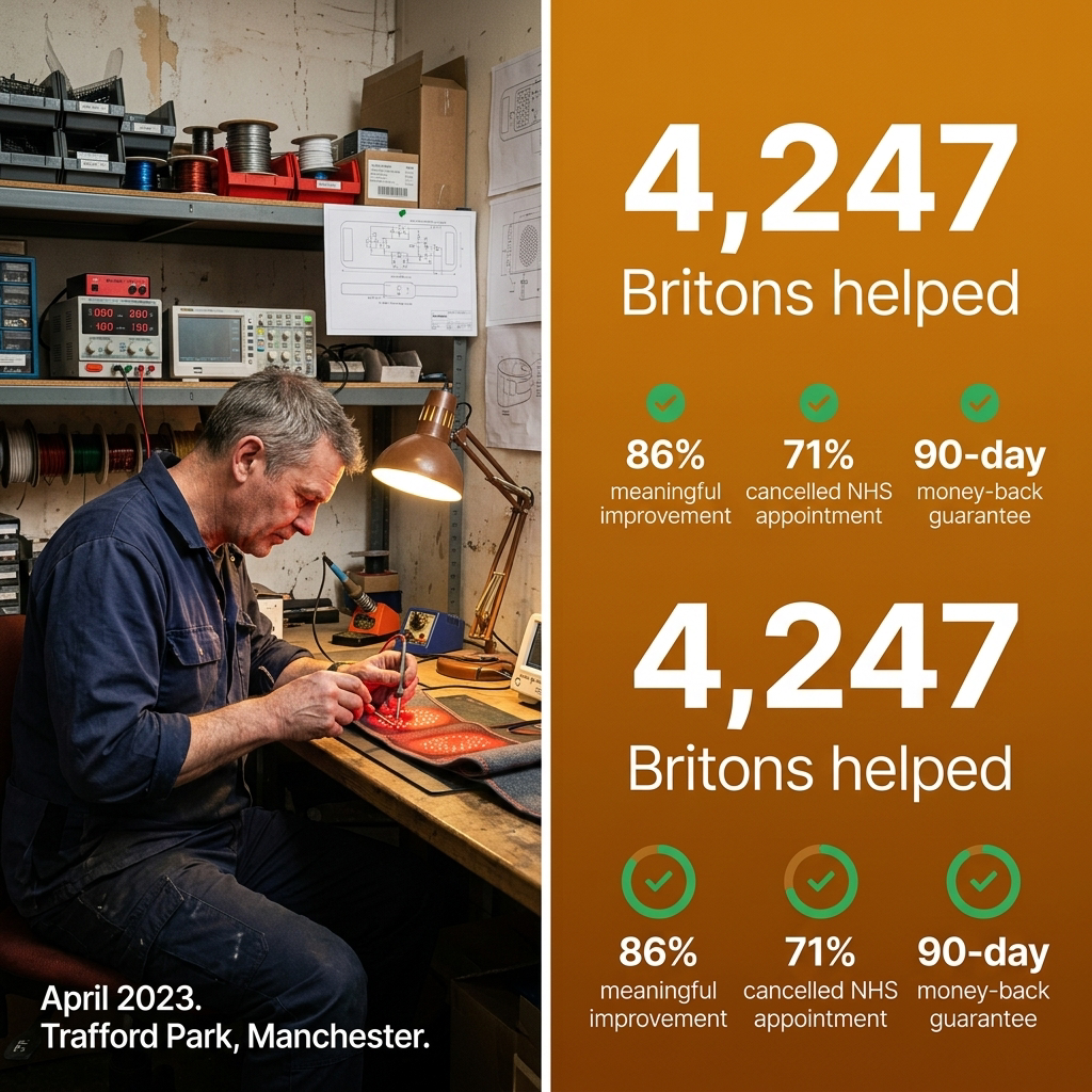 Daniel didn't build this in a sterile facility. He built it in his workshop in Trafford Park, Manchester — surrounded by clinical LED components, test rigs, and the singular determination to walk his daughter down the aisle.